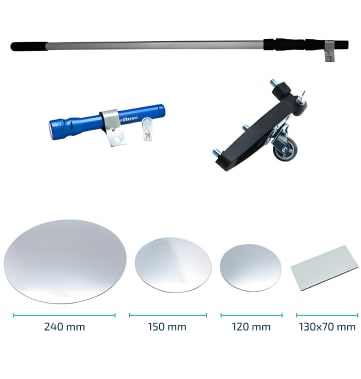 The set includes four inspection mirrors of the following sizes: 240 mm, 150 mm, 120mm and 130x70mm. The main advantage of the inspection mirrors is the ability to change them.